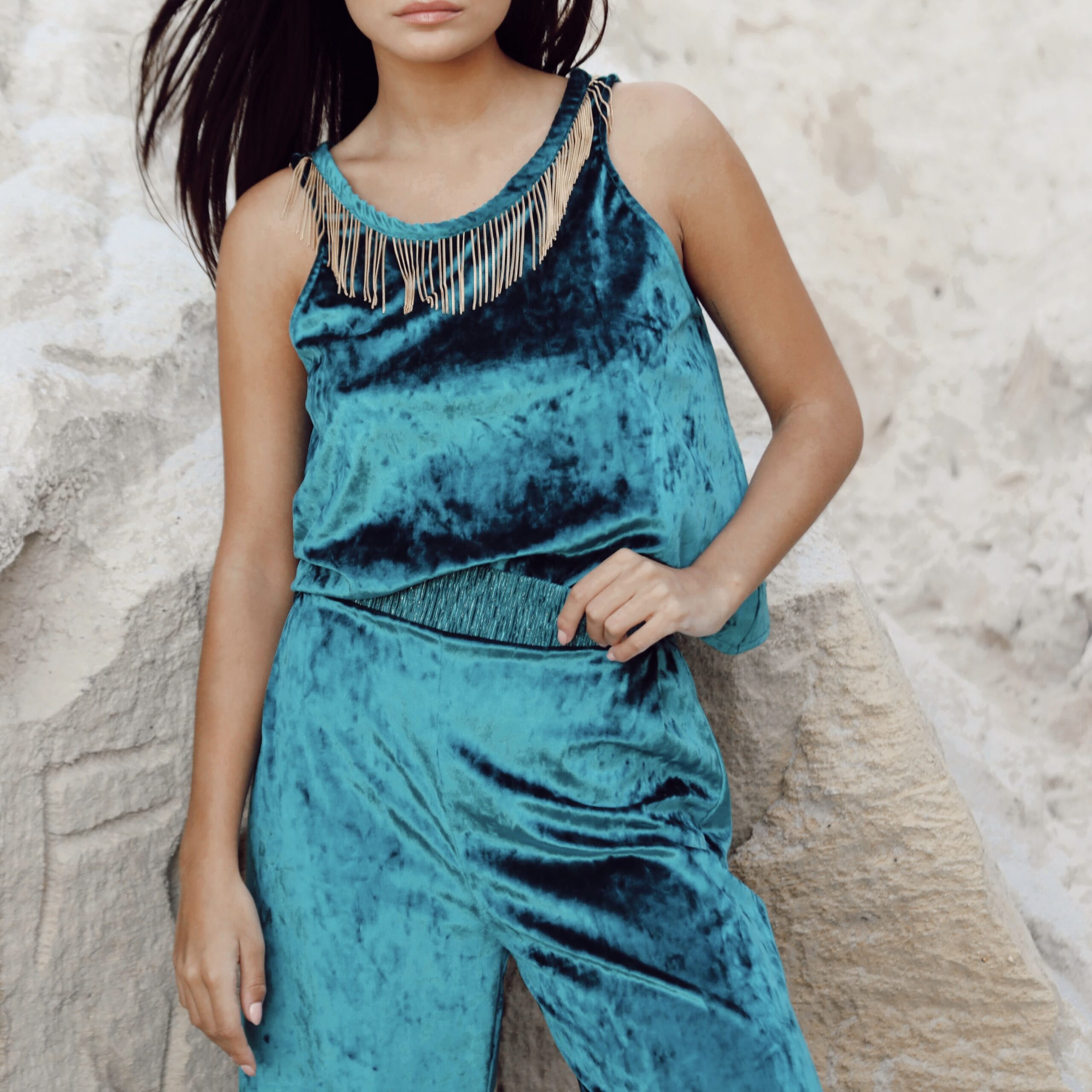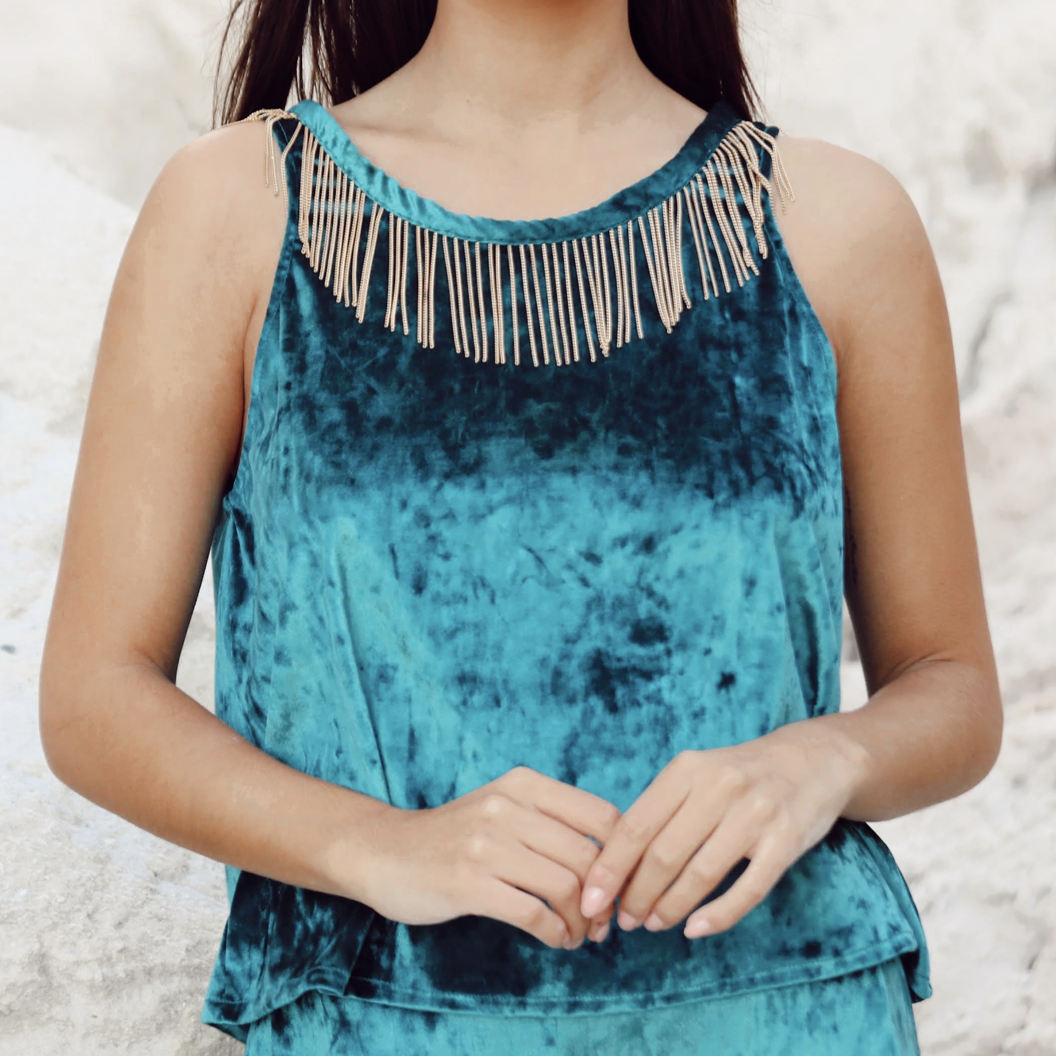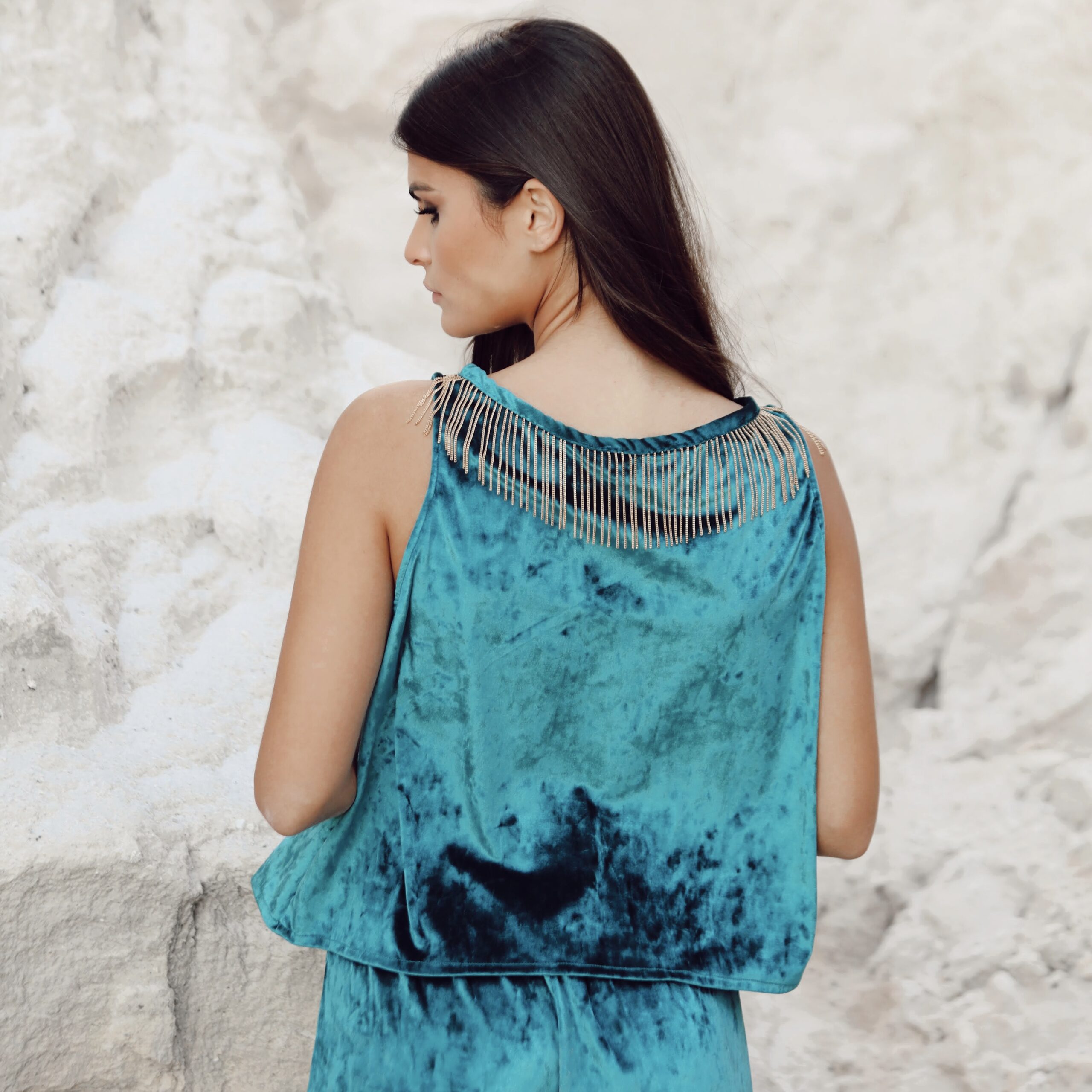 Short dress with armhole sleeves made of a fabric with metallic dots.
