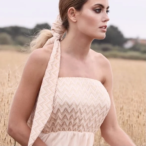 La Robe Blanche Atenas est une pièce avec un top en maille élastique de couleur ivoire avec du lurex doré et la présence d’une doublure de la même couleur pour éviter les transparences.