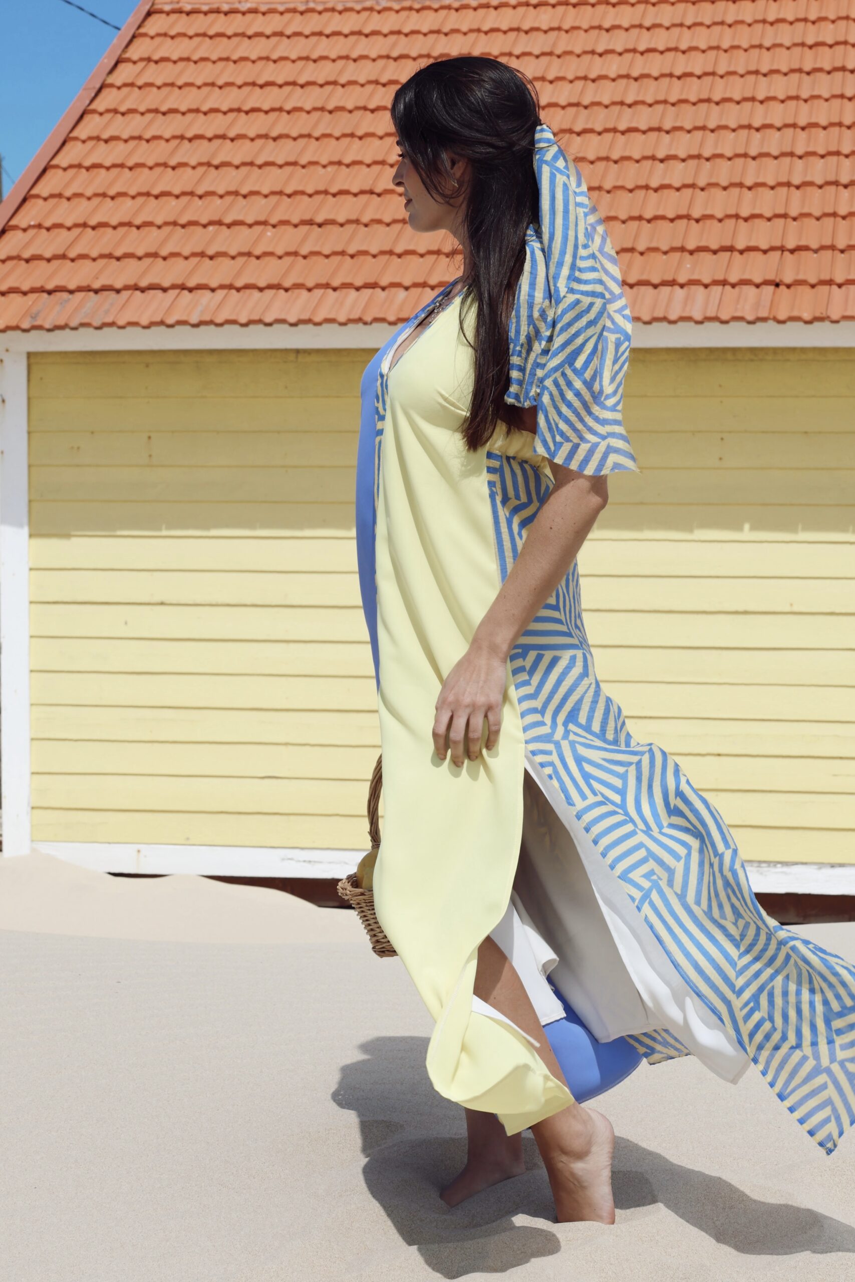 Robe longue à décolleté en V et bretelles à nœud ajustables dans le cou.