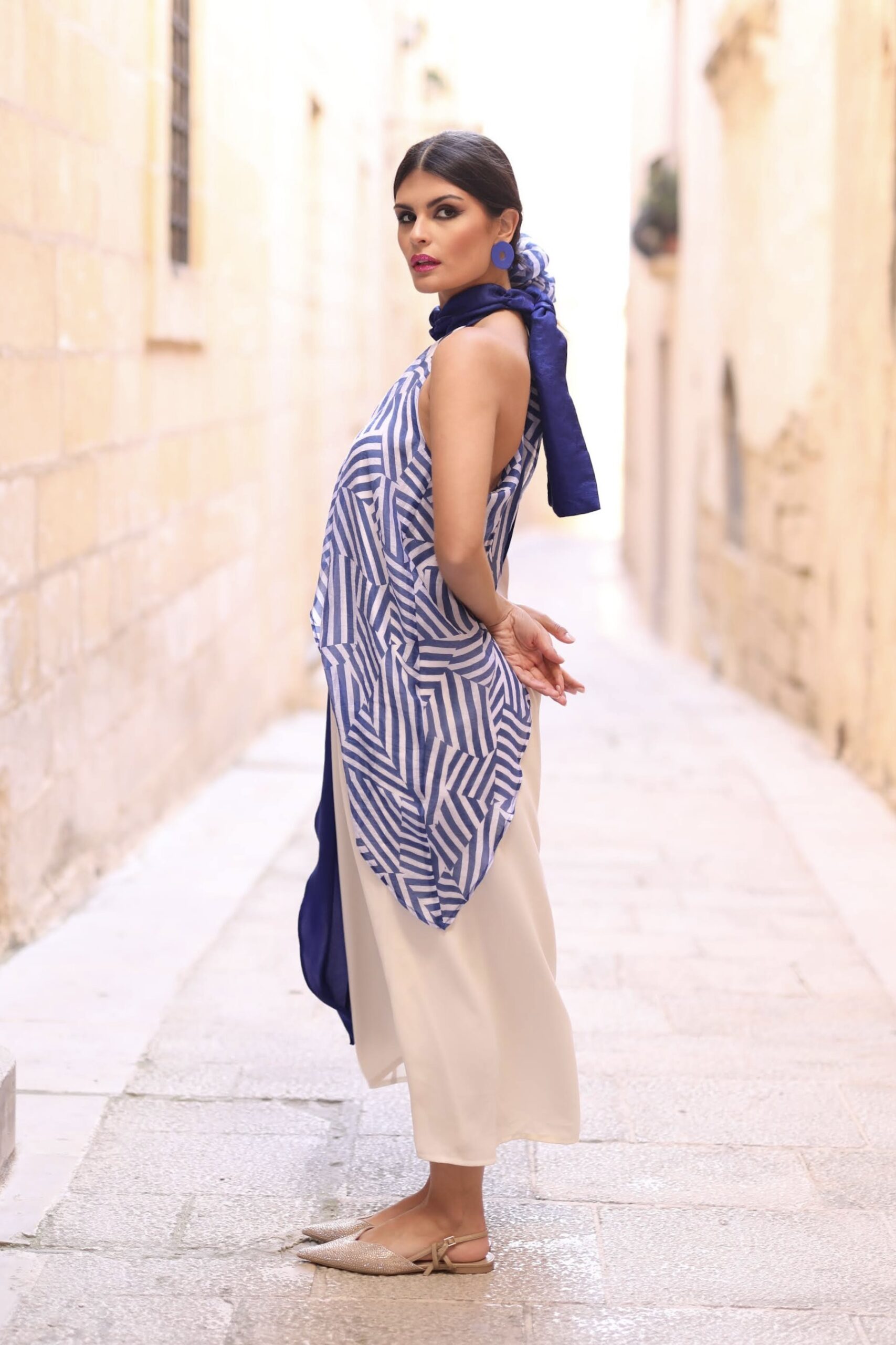 Composto por 2 camadas de tecido fluido que se envolvem nas aberturas laterais, frente e traseira.