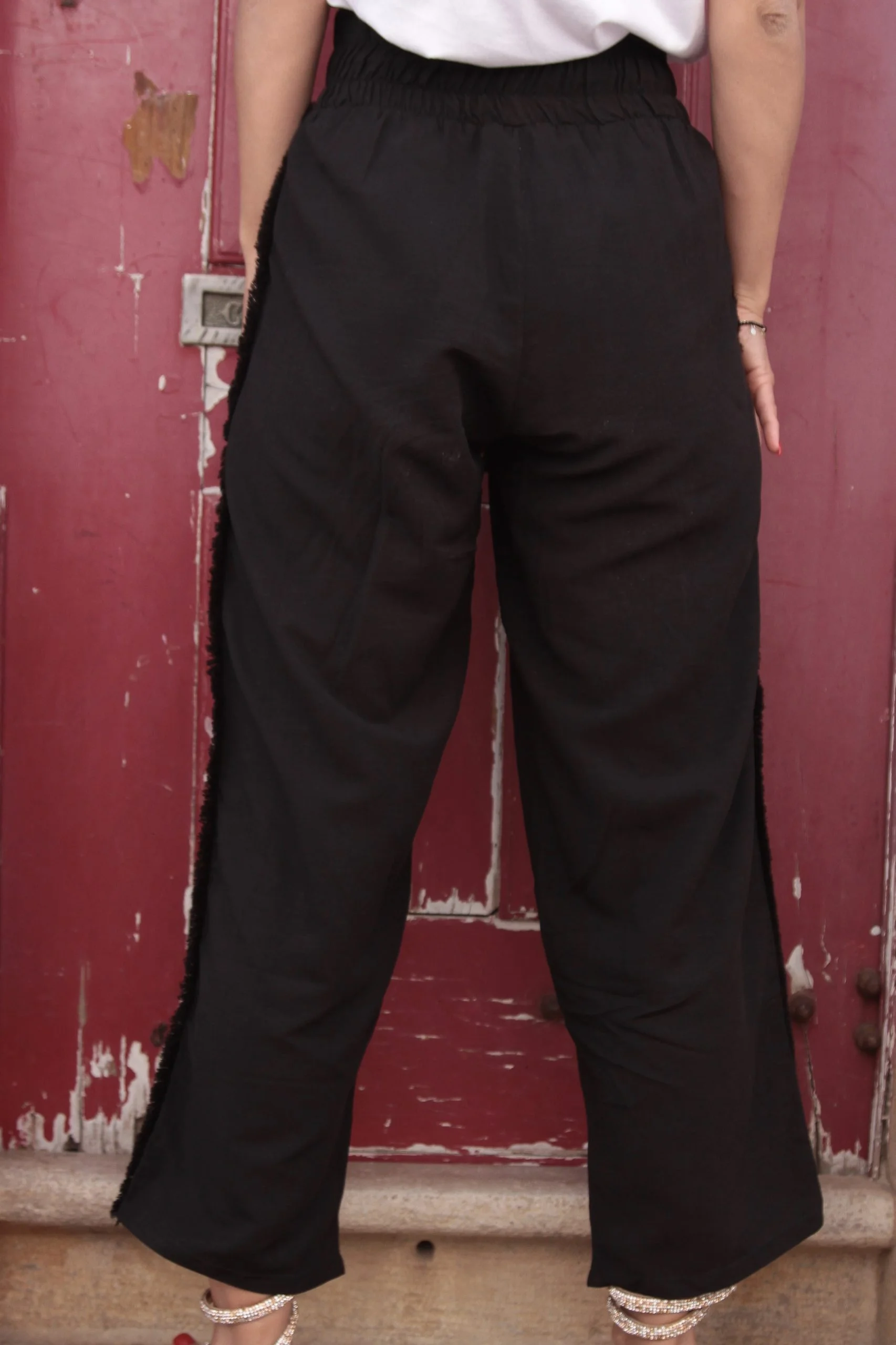 A calça ROCK é um modelo de peça largo, que se estende até à zona do tornozelo, com a particularidade de apresentar um cós subido, justo e modelador. Possui um friso de franjas preto debruado a dourado nas laterais e um cinto de cordão que possibilita ajustar e decorar a cintura. O cinto apresenta terminações em penachos e acessórios dourados.