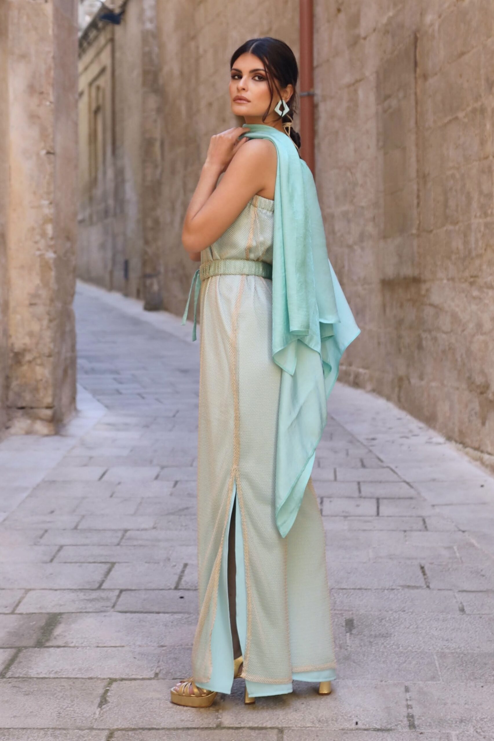 Apresenta um cinto elástico e uma capa tipo Écharpe.