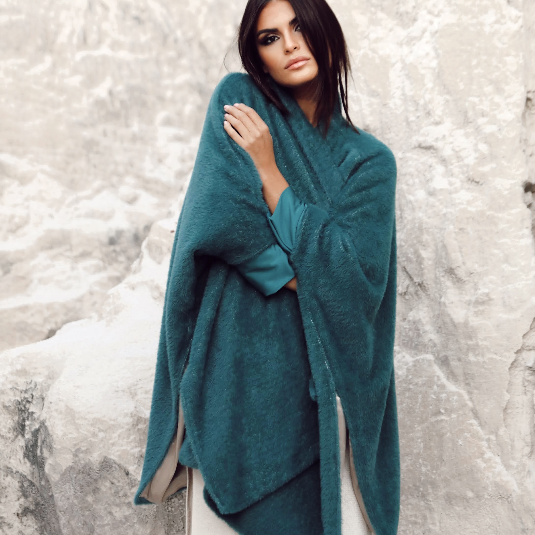 Casaco fluido tipo capa com rachas fundas laterais.
