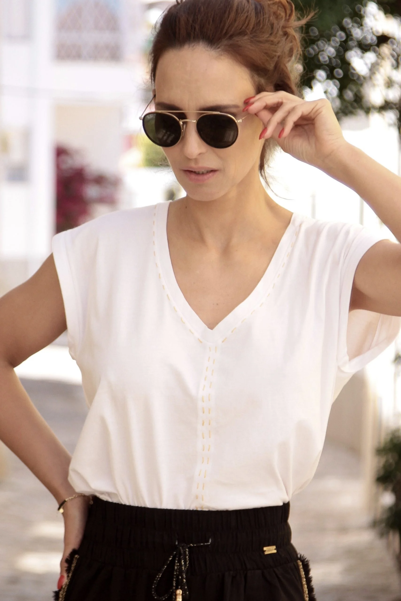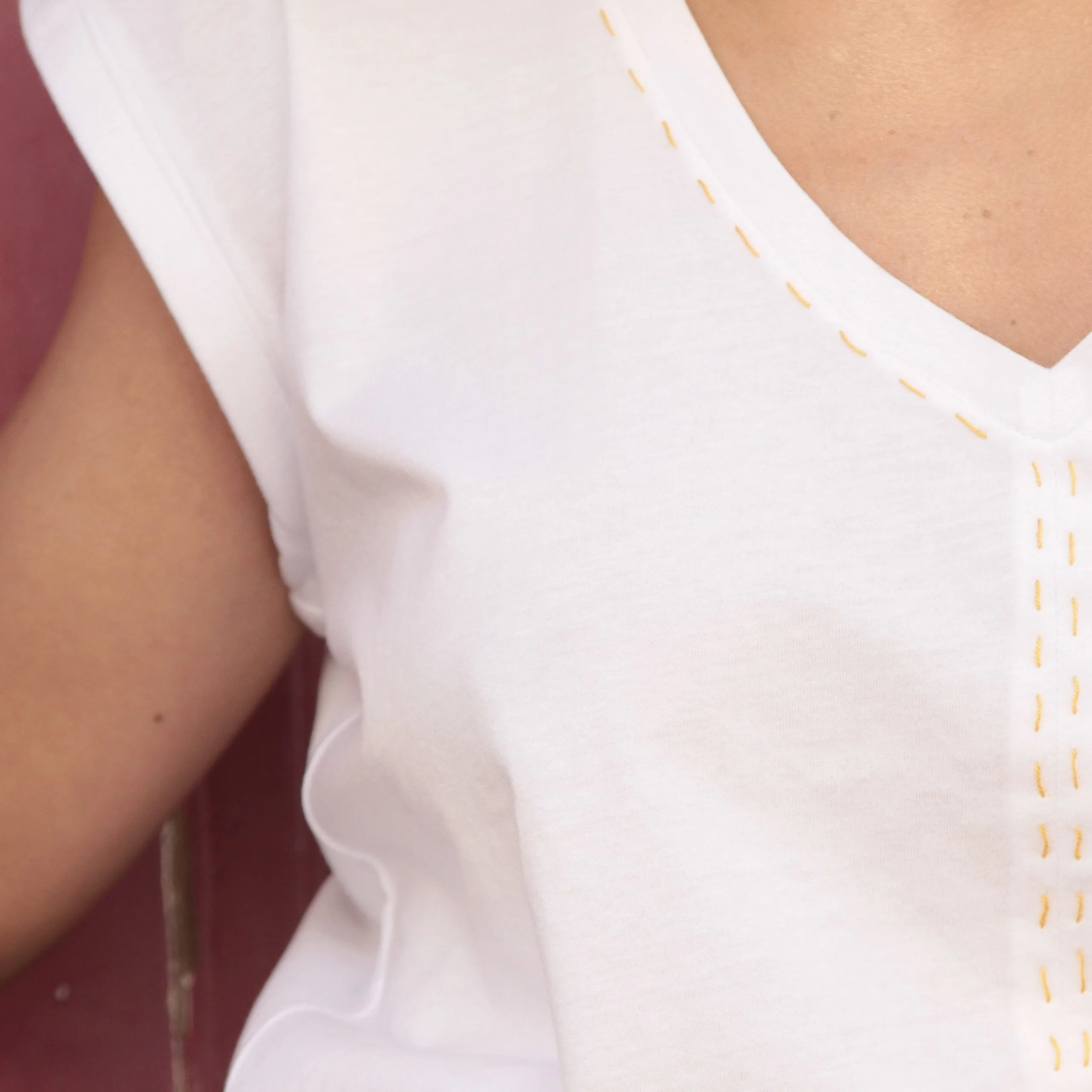 É uma peça de decote em “V”, de manga curta que cai a direito. É toda lisa e tem a presença de pespontos amarelo dourado confeccionados manualmente.