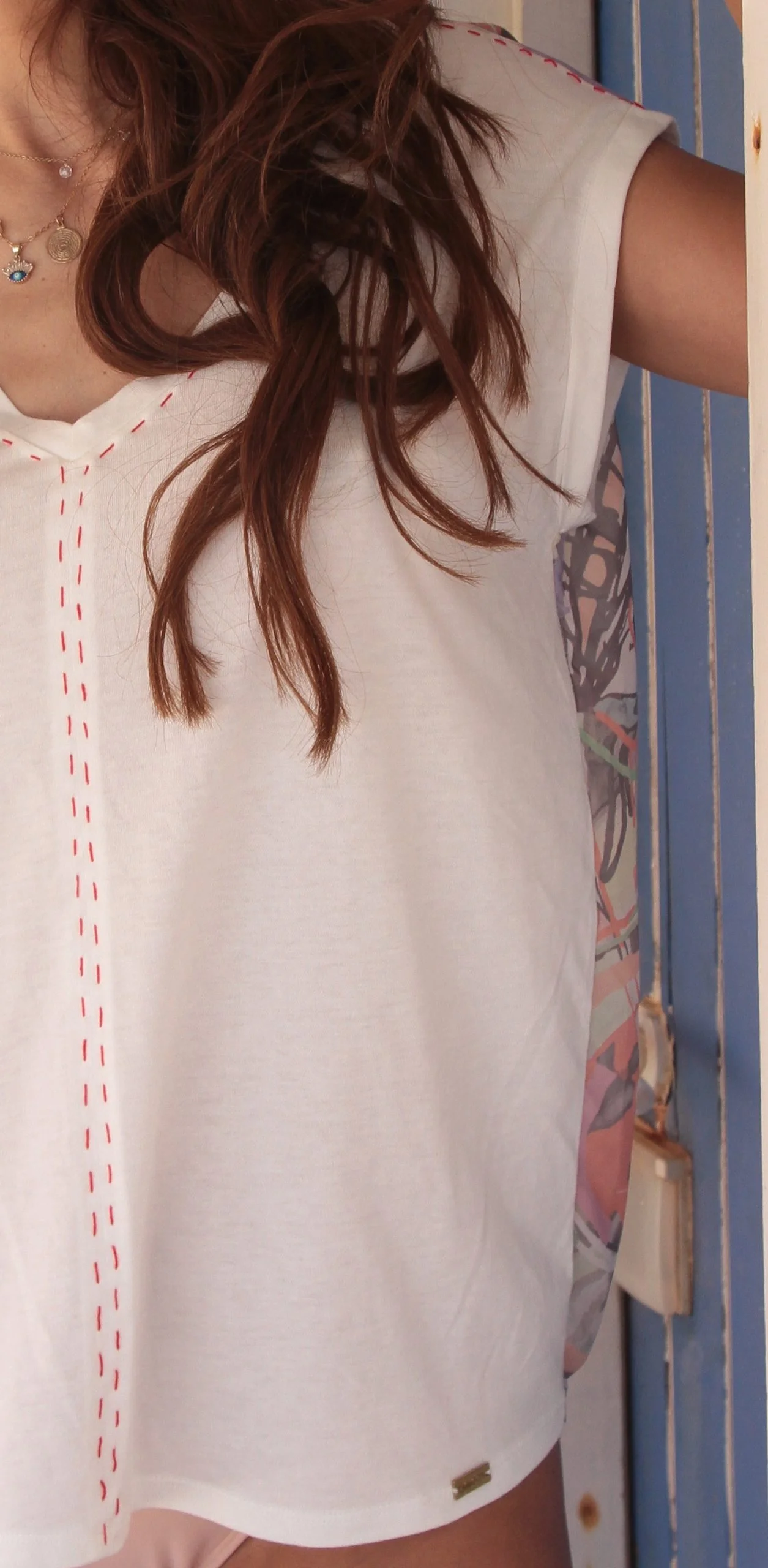A t-shirt FACE é uma peça de decote em “V”, de manga curta que cai a direito. É lisa na frente apresenta um padrão em tecido semi transparente nas costas.