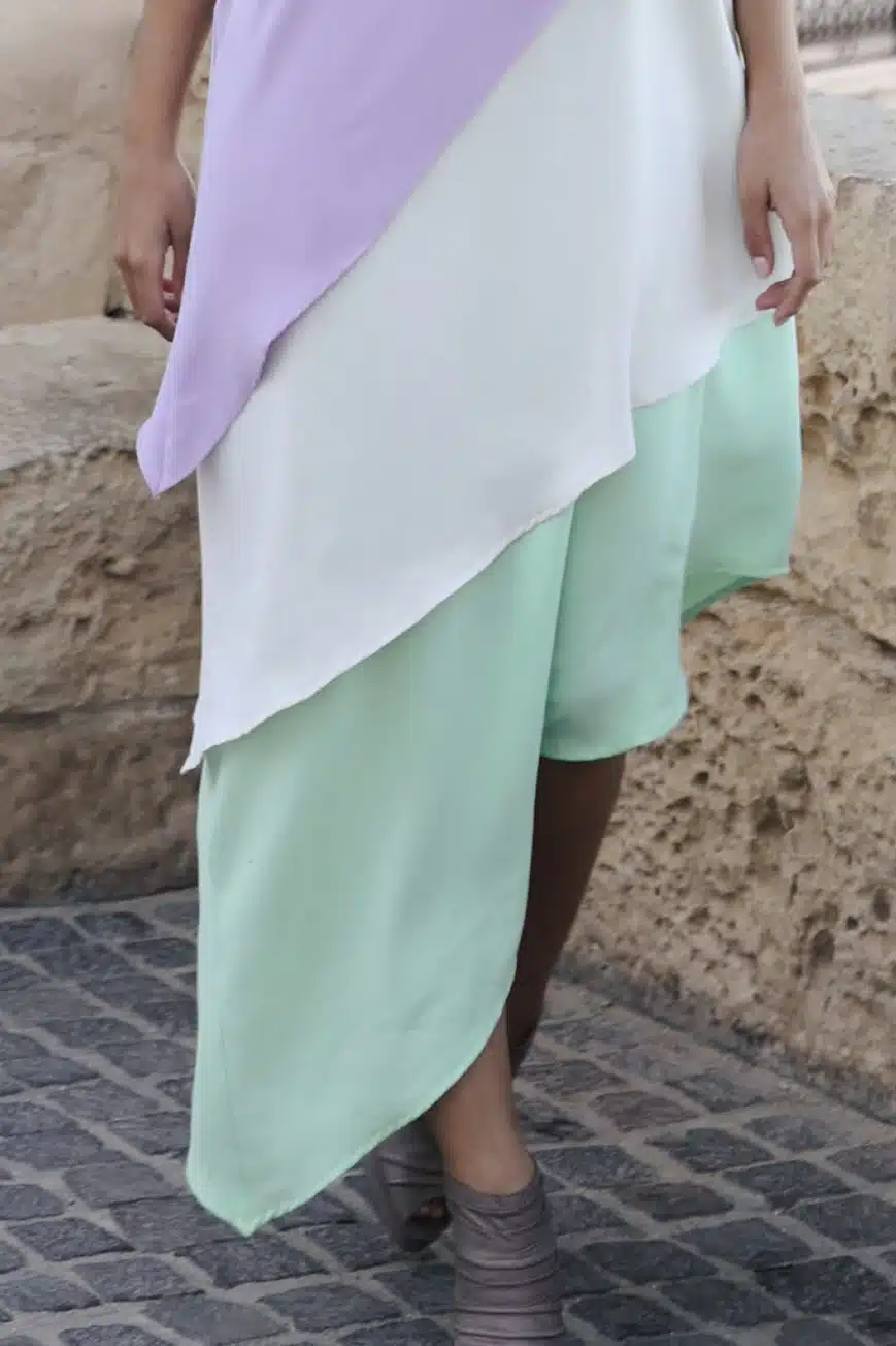 Composto por 3 camadas de tecido fluido que se sobrepõem em camadas e racha lateral.